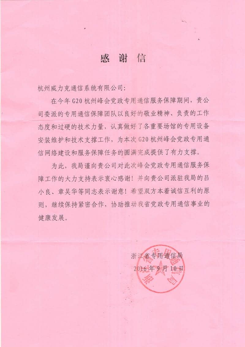 G20杭州峰会通信网络建设和服务保障优秀单位